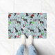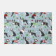 Cães bonitos de Natal em Boston Terrier em roupas festivas. Boston Terriers com casacos pretos e brancos seguram canas doces, vestem chapéus de Papai Noel, galhadas, suéteres com ornamentos espalhados.