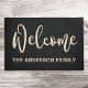 Porta com o texto "bem-vindo" em uma fonte neutra, marrom-claro, elegante, com seu nome de família abaixo em um fundo preto. Todas as cores são personalizáveis com a ferramenta design.
