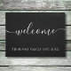 Porta personalizada de nome da família elegante com o nome da família com a data estabelecida em um texto branco clássico em um fundo preto com a mensagem "bem-vindo" que é definida em um texto elegante de script branco. Personalize com seus detalhes e personalize a cor para a cor de sua escolha. Projetado por Thisnotme©