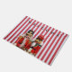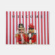 Duas bolachas coloridas num fundo listrado vermelho e branco