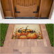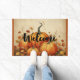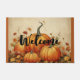 Uma porta bem-vinda com uma ilustração rústica com abóboras laranja e folhas de queda. Uma vibração do outono.