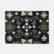 Ornate black and white floral pattern with gold accents. Central symmetrical flower surrounded by leaf motifs and intricate branches. Elegant, decorative design.