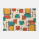 Um padrão de abstrato de arte da era atômica de na moda 1950 com quadrados castanhos escuros na turquesa, laranja queimada e ouro.