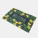 Porta-voz bem-vinda com um padrão fofo que apresenta limões amarelos e fruta limão verde com pedúnculos de folhas sobre fundo verde escuro.