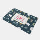 Um tapete de porta com um padrão festivo caprichoso. Ursos polares, renas, árvores, raposas e flocos de neve. Num fundo verde escuro. Um quadro retangular com uma borda falsa de folha de ouro com paz amor e alegria, dentro escrito.