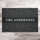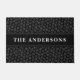 Porta elegante com estampas de pata de cinza escura em fundo preto e seu sobrenome ou nome de empresa.
