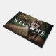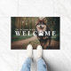 Um tapete de porta de boas-vindas para uma família com cães ou gatos. Bem-vindos em letras brancas grandes como uma sobreposição em uma foto do seu animal de estimação. Uma impressão de pata em vez de O em Welcome. Adicione seu nome de família e ano estabelecido.