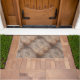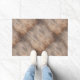 Um tapete legal, rústico, com fotografia de uma velha prancha de madeira.