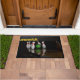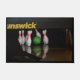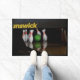 Uma porta com foto de uma bola de boliche derrubando pinos de boliche.