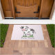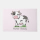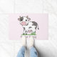 Uma porta cor-de-rosa com uma bonita vaca no estilo cartoon. Você pode adicionar texto personalizado, como nome da família ou mensagem de boas-vindas. Também pode ser um presente excelente para uma festa de inauguração!