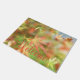 No cenário das folhas verdes de verão de um ácer japonês que fluía para vermelhos e amarelos do outono, uma folha de esqueleto de rosa e ouro desce lentamente para o chão.
