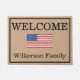 Este tapete de porta personalizado ou tapete ao ar livre apresenta uma imagem da bandeira dos Estados Unidos da América no centro sobre um fundo de cor bege. A saudação "WELCOME" é impressa acima da imagem do sinalizador com um nome de família de amostra impresso perto da parte inferior. A bandeira americana apresenta belas e ousadas listras vermelhas e brancas com estrelas brancas sobre azul escuro.