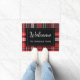 Design de xadrez vermelho com um texto que lê Bem-vindo e opção para adicionar seu nome de família personalizado.