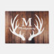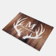 Etapa até no chique da fazenda! Este doormat de madeira marrom profundo, rico, rústico das pranchas do celeiro tem uma silhueta branca torrada dos antlers dos cervos e sua letra personalizada do nome e do monograma de família. Termine fora sua casa da quinta com este grande doormat para cumprimentar seus convidados.