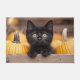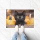 Adorável gatinho preto com olhos de ouro espreita de uma caixa cercada por abóboras.