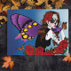 Dia da fada do crânio de açúcar morto com asas roxas e rosas vermelhas ao redor num pano de fundo de borboletas azuis e monarcas