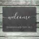 Porta personalizada elegante com o nome da sua família com a data estabelecida num texto branco clássico num fundo de quadro com a mensagem "bem-vindo" que é definida num texto elegante de script branco. Projetado por Thisnotme©