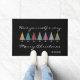 This Christmas Trees doormat has seven retro Christmas trees lined up with a lovely holiday greeting that you can keep or change. Personalize this Christmas doormat with your surname. You can also change the black background to a different color. A fun mid century modern Christmas doormat.
