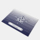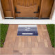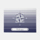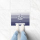 Este doormat caracteriza um design náutico com um rosa de compasso ornamentado em listras azuis e brancas e uma etiqueta com texto customizável.