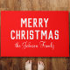Uma porta de Natal clássica com uma cor vermelha vibrante. Apresentando um texto branco ousado e moderno que diz "Feliz Natal", ao lado de um nome escrito à mão ou sobrenome personalizado do destinatário, fazer-o um toque atencioso e único para a oferta de férias.