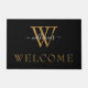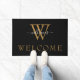 Cumprimente seus hóspedes em estilo com esta simples porta preta personalizada apresentando seu monograma em ouro falso com seu nome acima em um moderno roteiro de cinzas com letra de mão. Abaixo, lê-se "Bem-vindo".