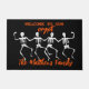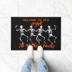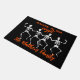 Esta porta divertida apresenta quatro esqueletos em um fundo preto com texto laranja que diz: Bem-vindo à nossa cripta. Personalize facilmente este tapete espantado com um nome personalizado, outro texto ou remova-o completamente.