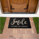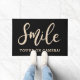 Porta com o texto "Sorria que está na câmera". Texto castanho claro neutro sobre fundo preto. Todas as cores são personalizáveis.