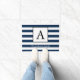 Marinho náutico e listras brancas com o nome da sua família em branco e letra monográfica em preto.