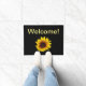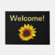 Feliz girassol amarelo num tapete preto de boas-vindas. A cor de fundo e o tipo de texto são personalizáveis.
