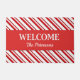 Porta em faixas de canas diagonais, de cor vermelha e branca, com texto personalizado