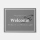 O tapete da porta é mostrado em cinzas e tem uma borda branca e texto. O texto diz " Todos os dias nós nos erguemos" " Bem-vindo" em ousado impressão no centro e " nós escolhemos servir ao Senhor nosso DEUS". Imagem delineada de uma pomba atrás da palavra 'Bem-vindo'. Personalize este tapete ou comprar como está.