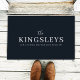 Um tapete de porta de férias moderno, na moda, moderno, com o seu sobrenome, representado na tipografia clássica, emparelhado com um guião manuscrito em branco, uma linda cor azul-escura de preto. Uma design mínima impressionante para se destacar da multidão nesta época de natal!