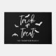Bem-vindos convidados com espírito de Halloween usando esta porta moderna. O design apresenta Trick ou Tratat em tipografia de script branco nítido com silhuetas de morcego lúdico contra um fundo preto em negrito. Uma área de texto personalizável sob o design permite adicionar um nome de família ou uma mensagem de boas-vindas personalizadas, fazer-a como um toque único e festivo para a sua entrada durante a estação assustadora.