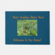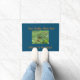Um Teal Escuro de 18"x24", Matriz de Porta Colorido, com uma Imagem, de uma Linda Borboleta Monarca, deitada na grama, nela, Com Laranja Médio, Cor. Texto, que permite personalizá-lo com "Seu nome de família aqui!", (no topo), e também diz " Bem-vindo à nossa casa!" (no fundo), do mesmo.