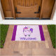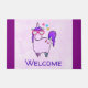 Uma porta bem-vinda com um desenho caprichoso de um monocórnio rosa legal e funso que tem uma mana e uma cauda roxas. Esta criatura fofinha está vestindo óculos de sol em forma de coração e é decorada com estrelas pequenas. Fundo de aquarela cor-de-rosa com uma faixa de magenta ao longo da borda esquerda e direita.