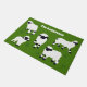 Este tapete de boas-vindas personalizado é perfeito para a sua fazenda ou para qualquer pessoa que ame ovelhas e outros animais de fazenda. Tem belas ilustrações de ovelhas Valais Blacknose em conjunto preto-e-branco contra fundo verde-grama. Está pronto para ser personalizado com seu nome em letras brancas em negrito.