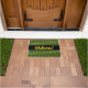 Características deste design da esteira de porta um teste padrão abstrato com líquido-como formas do splotch ou da gota, várias máscaras coloridas de claro e de verde escuro. Igualmente caracteriza a mensagem amigável "boa vinda!" na parte dianteira no amarelo roteiro-como o texto.