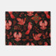 Vibrant red birds with detailed patterns are set against a black background, surrounded by intricate floral and leafy designs, creating a lively, ornamental scene.
