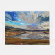 Uma design de arte de um lago com o dramático céu refletido na água do lago. Colinas e campos circundam o lago.