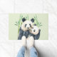 Uma porta com uma ilustração de aquarela fofa, com uma mãe branca e preta e um urso panda bebê se amontoando juntos. Mamãe está segurando seu filhote entre alguns caules verdes de bambu