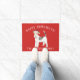 Adorável porta de Natal com um Cachorro de Fox Terrier, vestindo um chapéu santa em um fundo vermelho festivo.