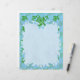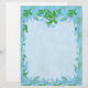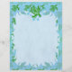 Tartaruga verde em estilo recortado contra fundo azul controlado. Papel de carta sem linhas. Papel timbrado vazio com borda estilizada de chama.