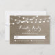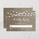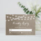 Design de placa de resposta RSVP de casamento moderno de verão com simples luzes de cordas brilhantes e elegantes penduradas no topo e uma mistura elegante de fontes modernas e caligráficas em um fundo de textura faux color. Um design de pré-disquete simples e na moda, perfeito para o verão! Clique no botão PERSONALIZAR TI para personalizar fontes, mover texto e criar seu próprio design de convite exclusivo.