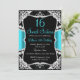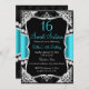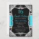Convite de aniversário Teal Blue Silver Black Sweet 16. Diamante azul e prata bonito tiara e design de damasco prateado. Notem, por favor, que todas as imagens planas não têm joias reais!