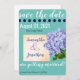 Personalize este cartão de data com a data do casamento, local e nomes de noiva e noiva. O cartão tem um esquema de cor lacrimejante, marinho e roxo com uma hidrangea.