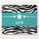 Trendy e moderna Estrela Sassy Zebra Mousepad com um fundo de impressão em preto e branco e uma ousada borda turquesa adornada com um divertido filme de estrela. Este design feminino pode ser personalizado com o texto personalizado de sua escolha. Clique em "Personalizar" para encontrar mais opções de personalização.