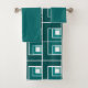 Este conjunto de toalhas tem um pano de lavagem, uma toalha de mão teal mais leve e uma toalha de banho com um design geométrico feito de Ls em tons de chalé dispostos em diferentes direções se repetindo no design.