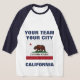 Um design gráfico da California Flag com os modelos de texto para sua equipe, sua cidade e Califórnia em uma t-shirt de raglan.