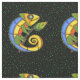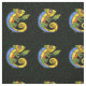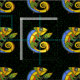 Este tecido personalizado do pátio tem uma imagem repetida de um vibrante lagarto abstrato em verde, amarelo, laranja e azul com grandes olhos redondos segurando um galho com uma folha sobre fundo preto com bolinhas verdes.