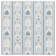 Este tecido de padrões apresenta o slogan "Ahoy it's boy" junto com gráficos náuticos como veleiros e âncoras e faixas verticais em tons de azul contra um fundo colorido creme.